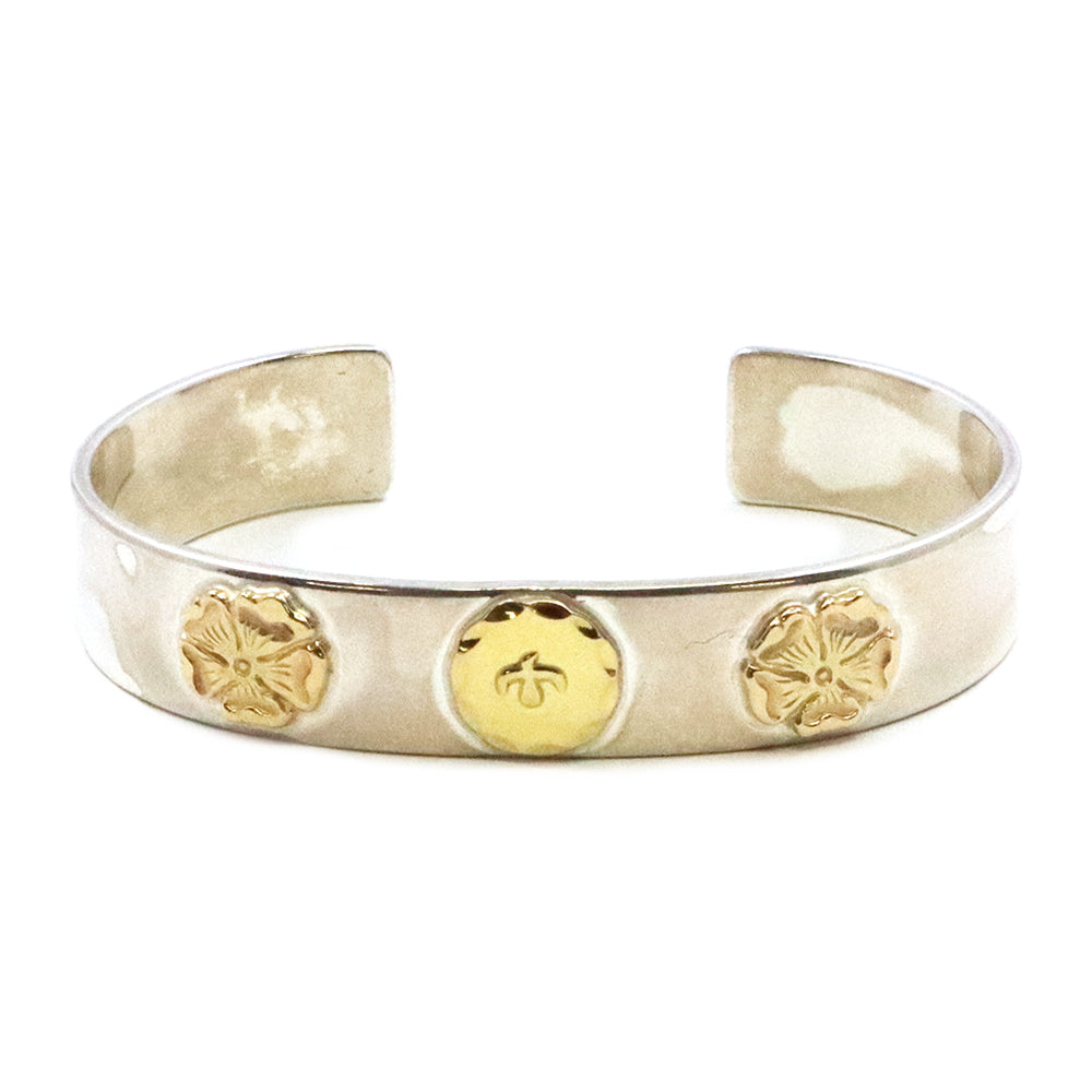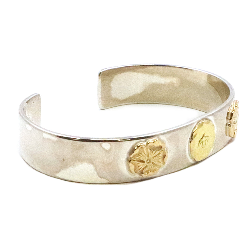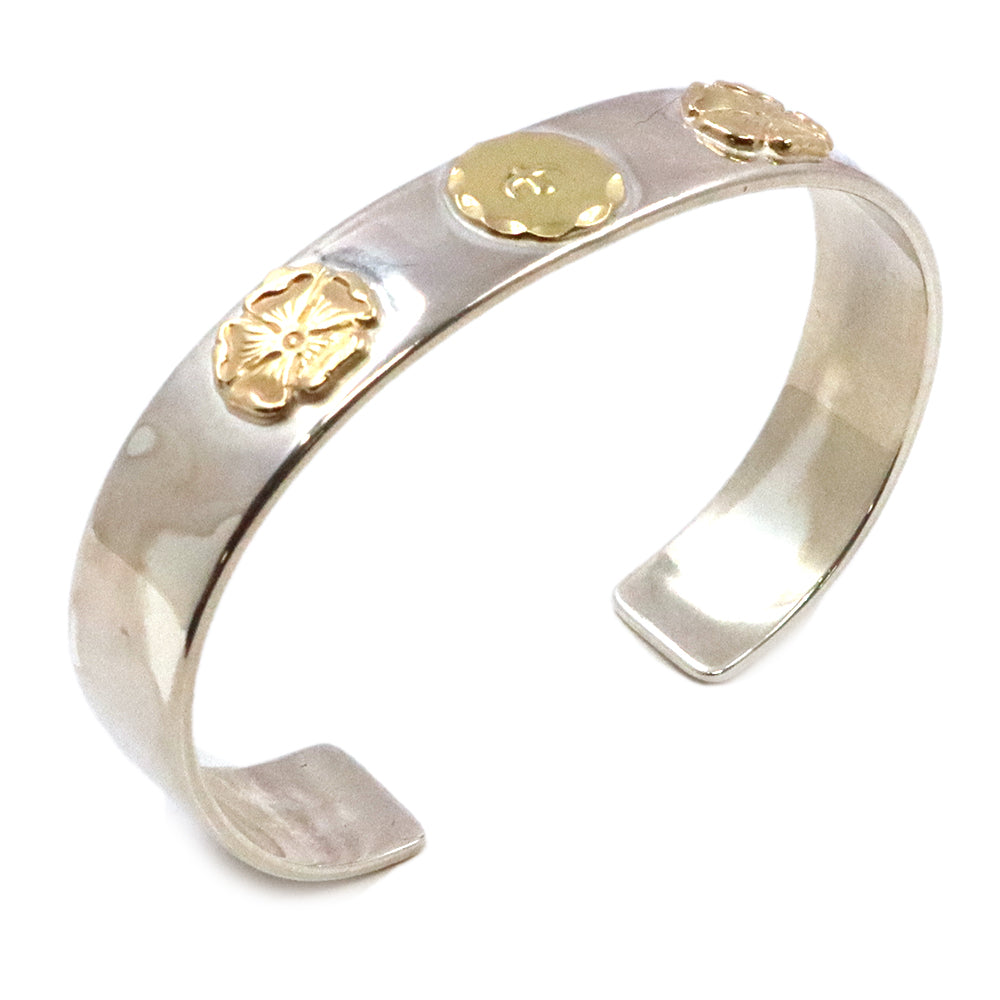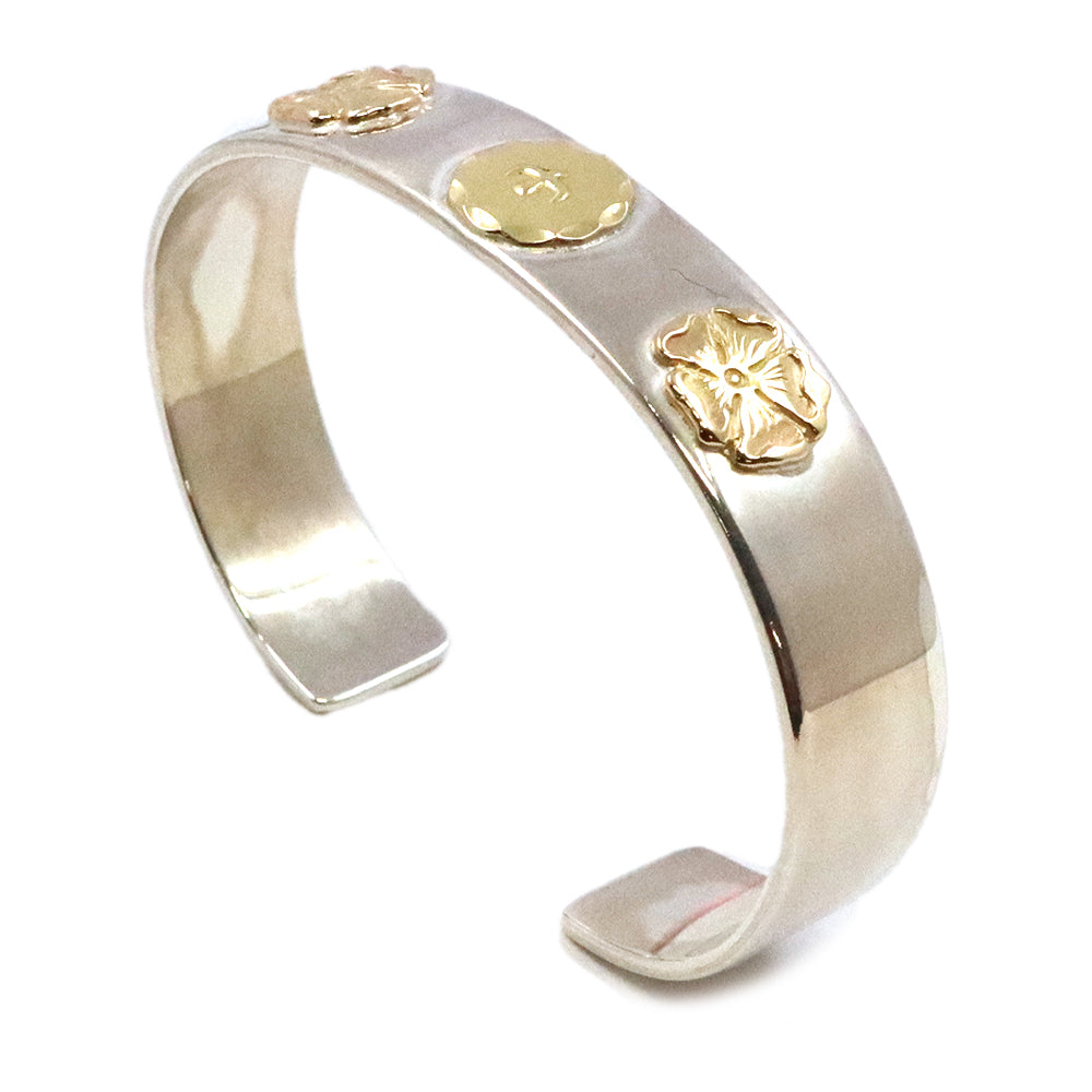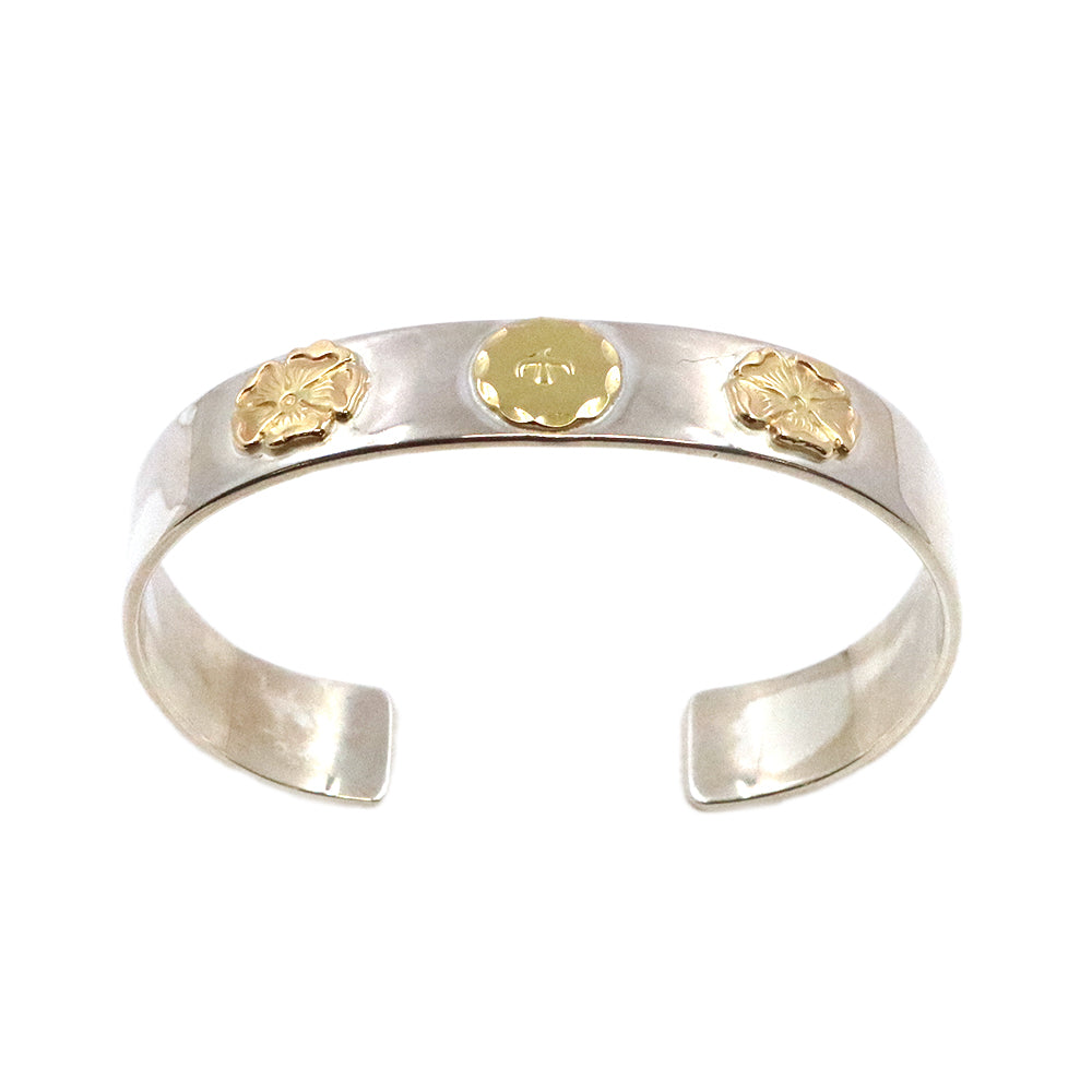 平打ちブレスのイーグルメタルの両脇にローズがロウ付けされた非常に華やかで豪華なブレスレットになります。経年変化に伴いゴールドのイーグルメタルとローズの輝きがより目立ちます。