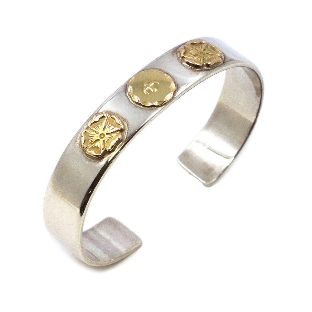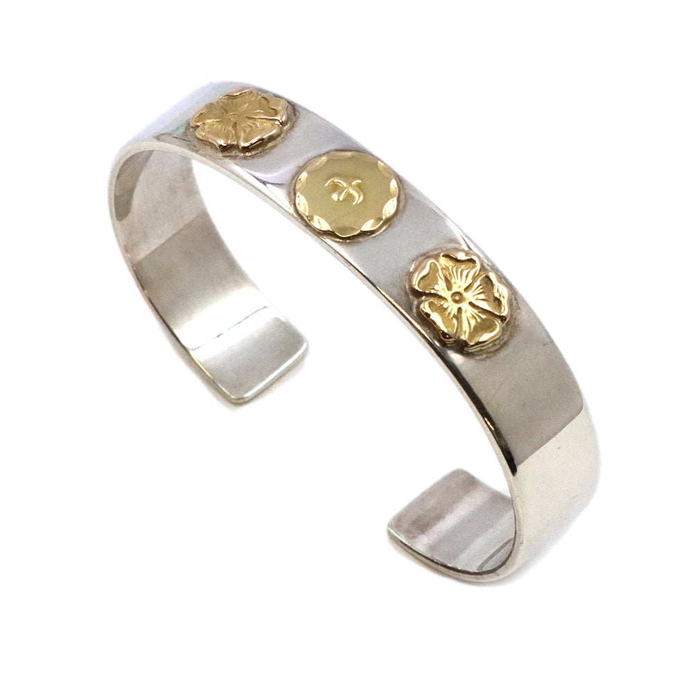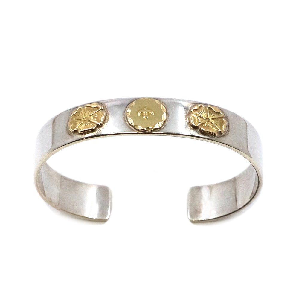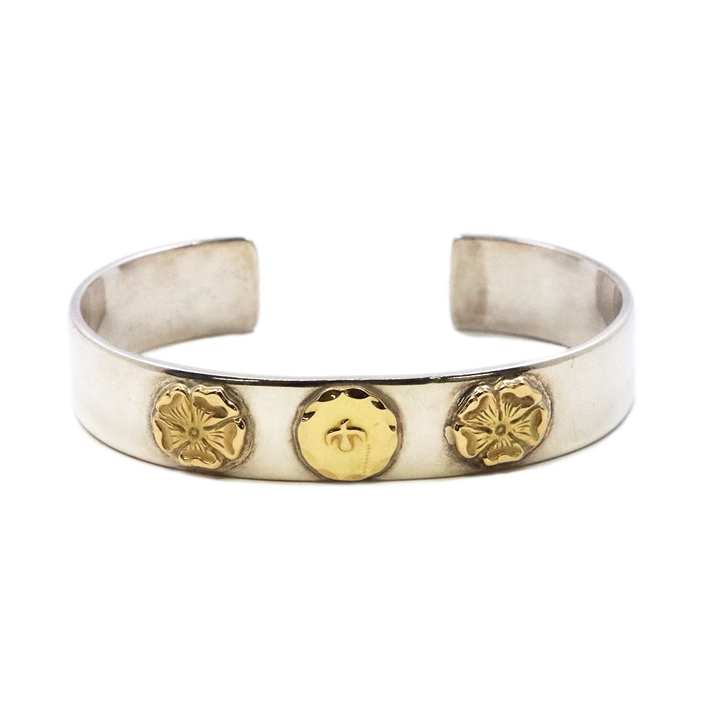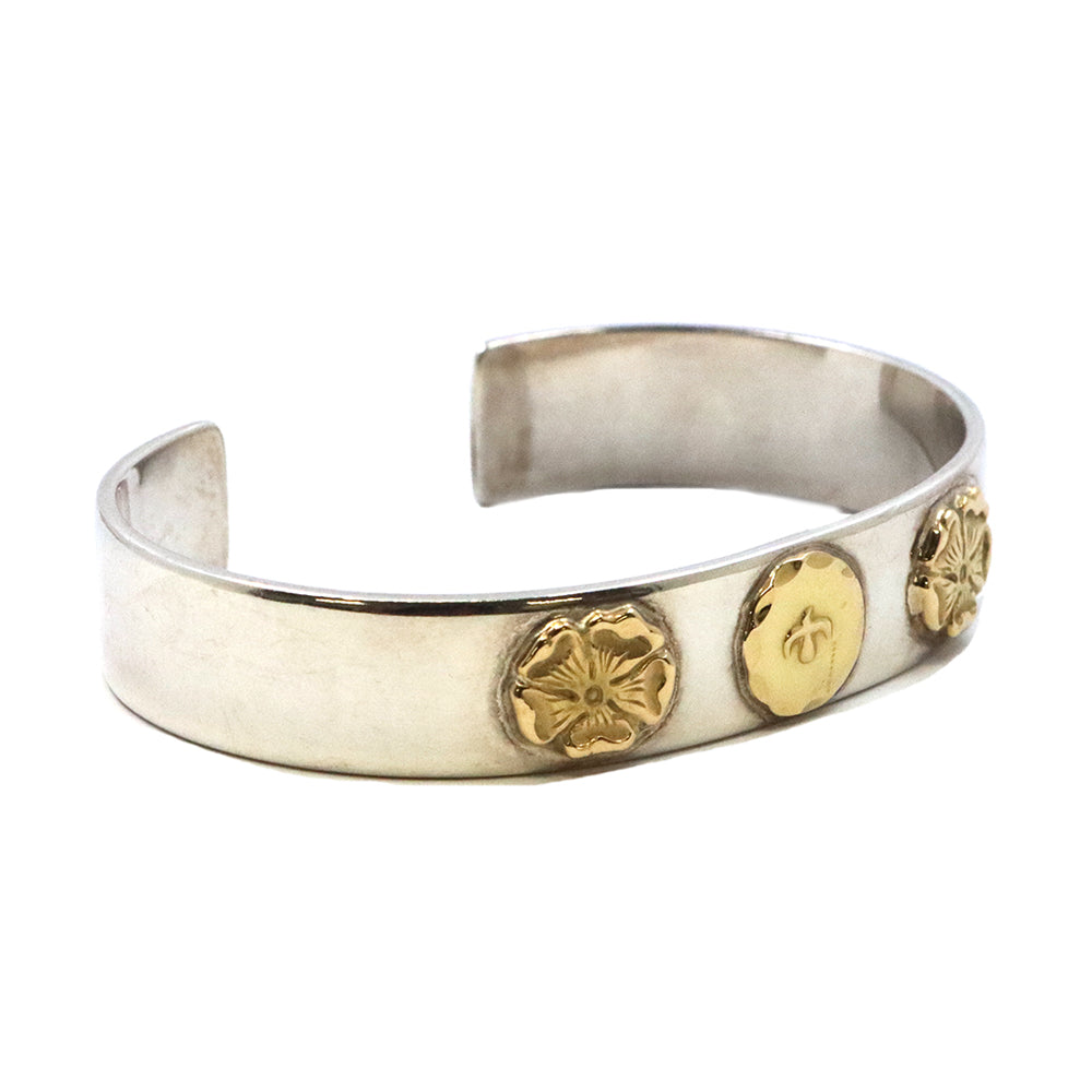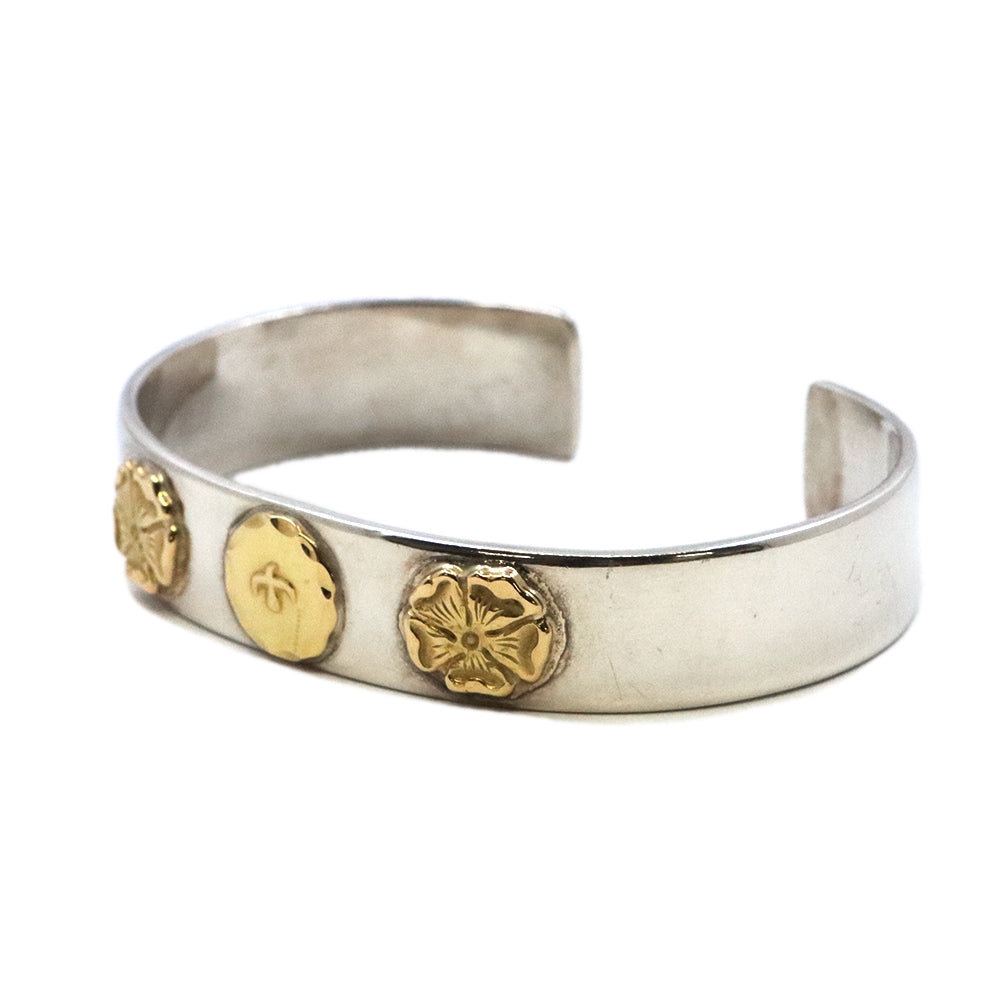 平打ちブレスのイーグルメタルの両脇にローズがロウ付けされた非常に華やかで豪華なブレスレットになります。経年変化に伴いゴールドのイーグルメタルとローズの輝きがより目立ちます。