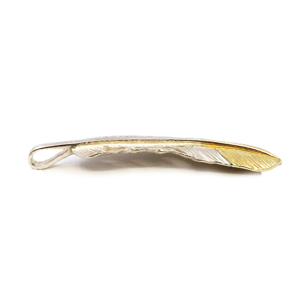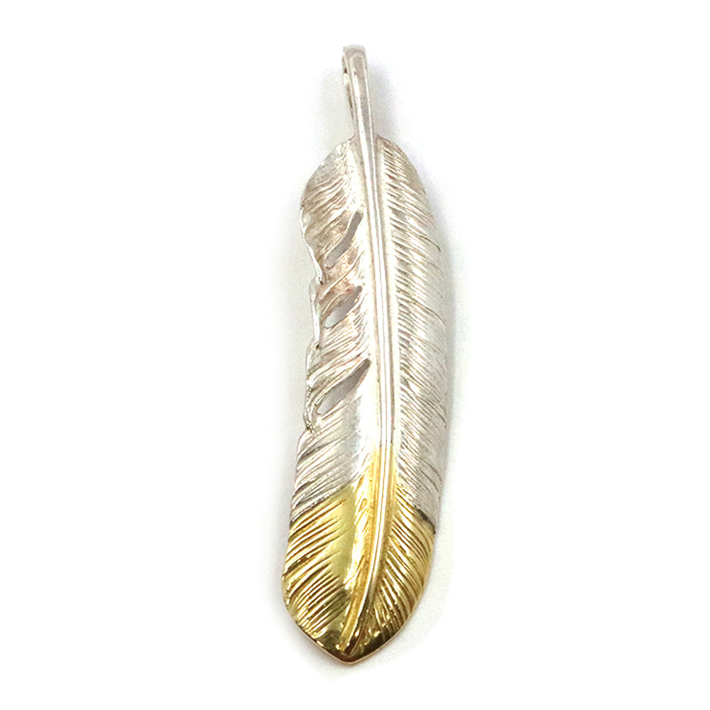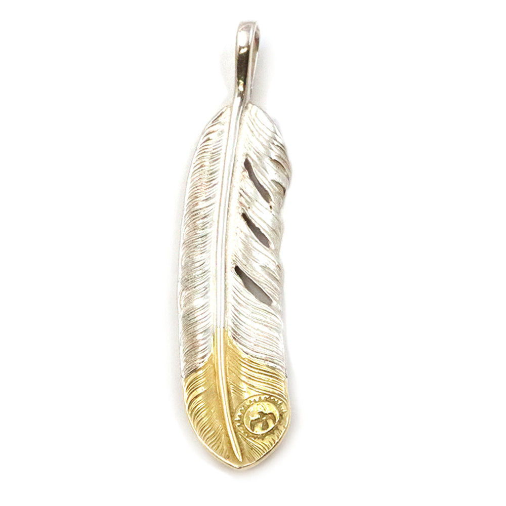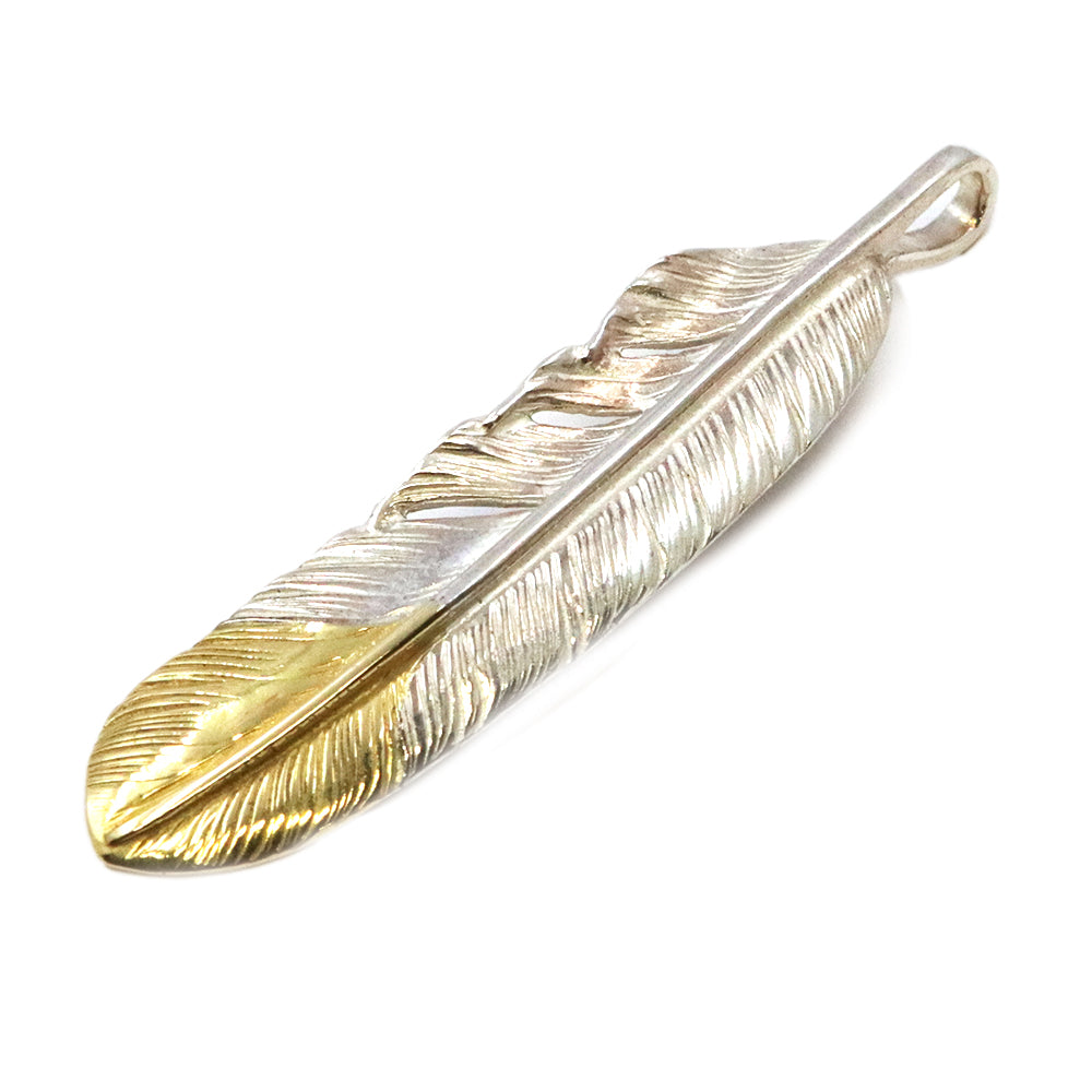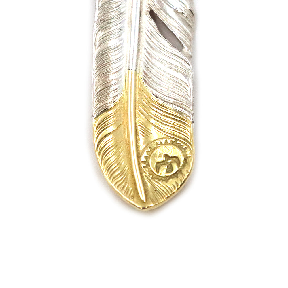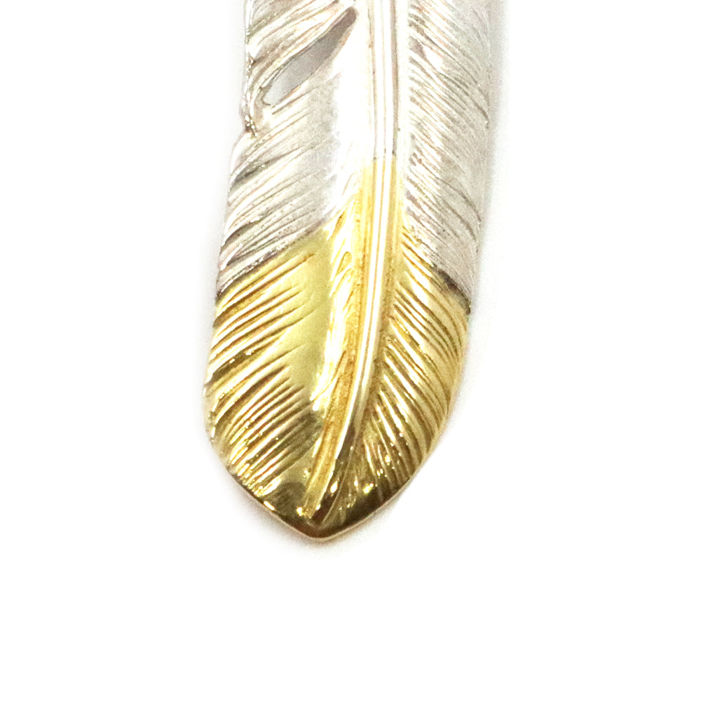 原宿ゴローズでの入手が困難になったことから価格が高騰したのがこちらの先金特大フェザーです。名前の通りシルバーのフェザーの先がゴールドで作られており、綺麗にロウ付けされ一体に見えように表現されております。トップにボリュームの無い形状である為、他のフェザーと組み合わせ易い点も魅力です。