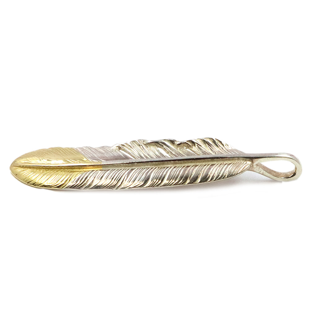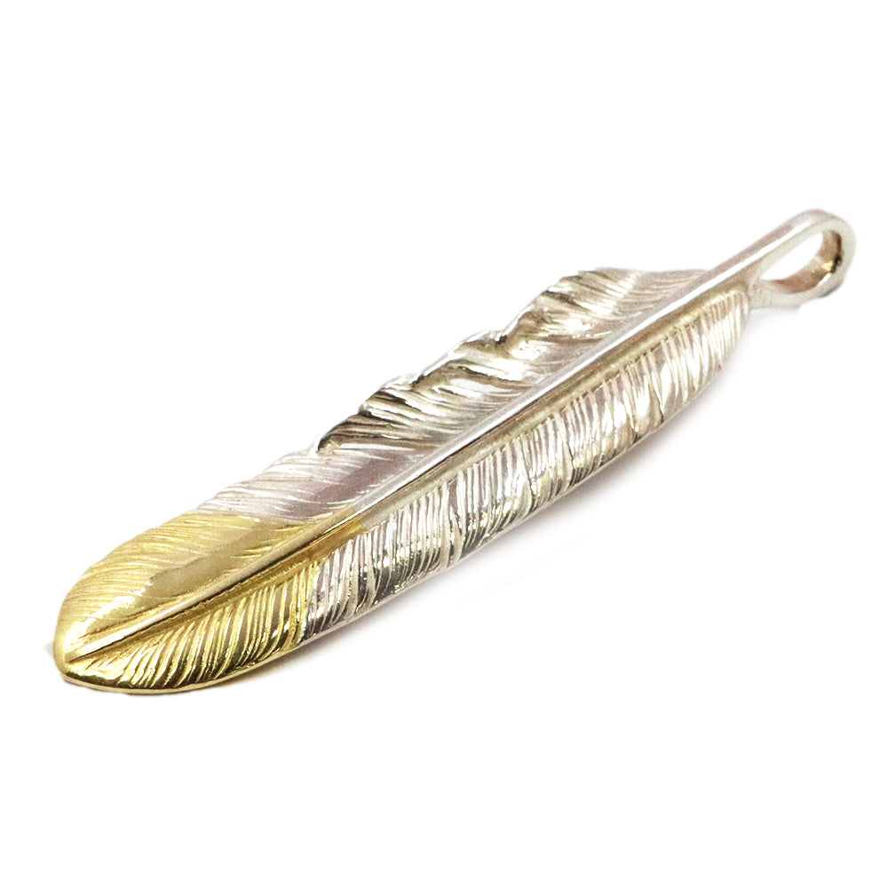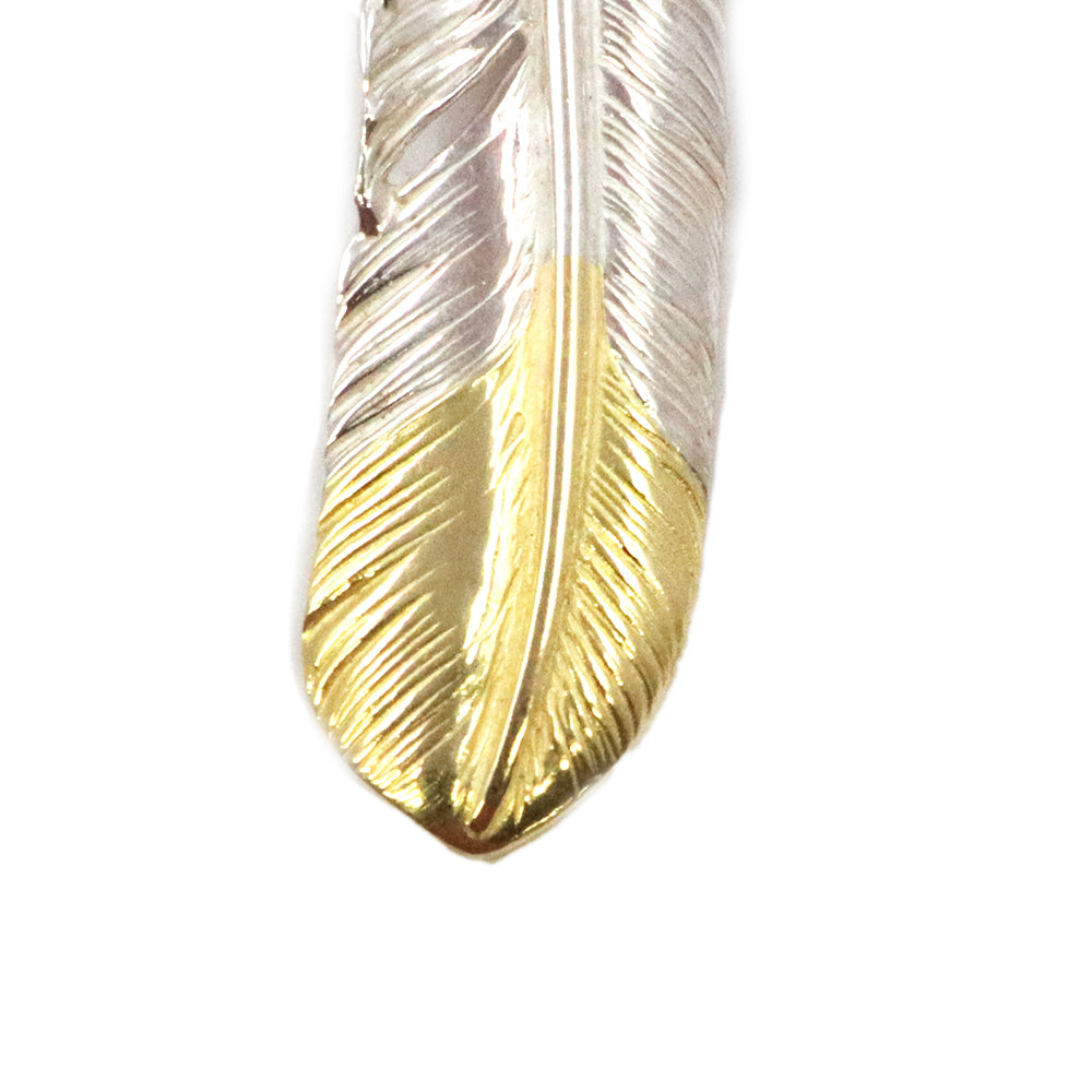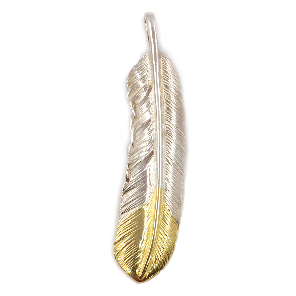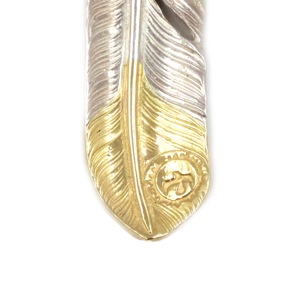 原宿ゴローズでの入手が困難になったことから価格が高騰したのがこちらの先金特大フェザーです。名前の通りシルバーのフェザーの先がゴールドで作られており、綺麗にロウ付けされ一体に見えように表現されております。トップにボリュームの無い形状である為、他のフェザーと組み合わせ易い点も魅力です。